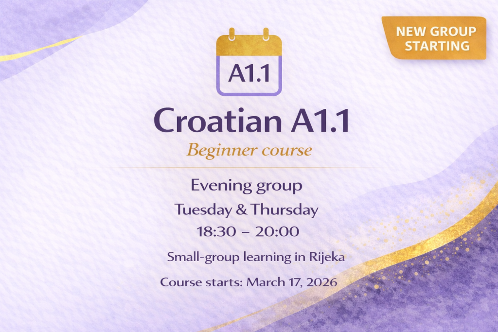 Join our in-person Croatian A1.1 beginner course in Rijeka and start learning in a small-group setting with clear guidance, practical communication and a structured approach designed for complete beginners.